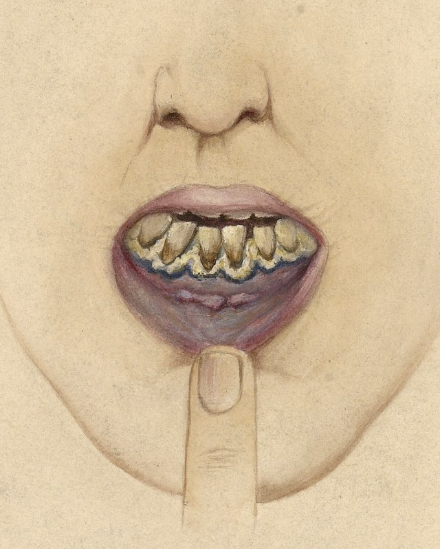 Watercolour drawing of the mouth and gums of a woman who worked in a lead-mill. There is saturnine impregnation with a well-marked Burton’s line and a blue stain on the buccal membrane opposite (source: Wikipedia)