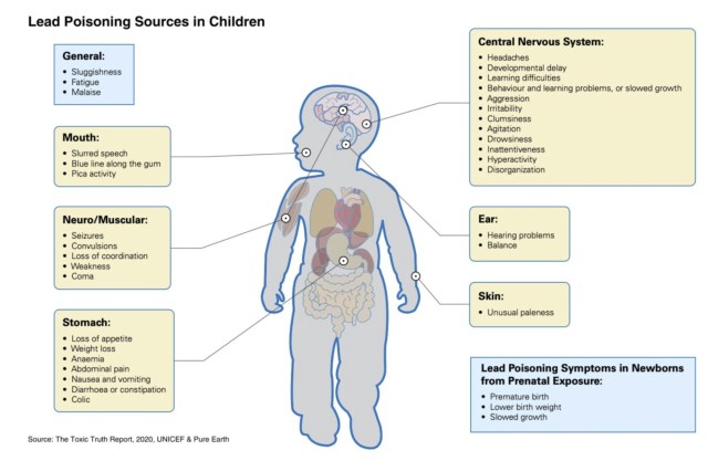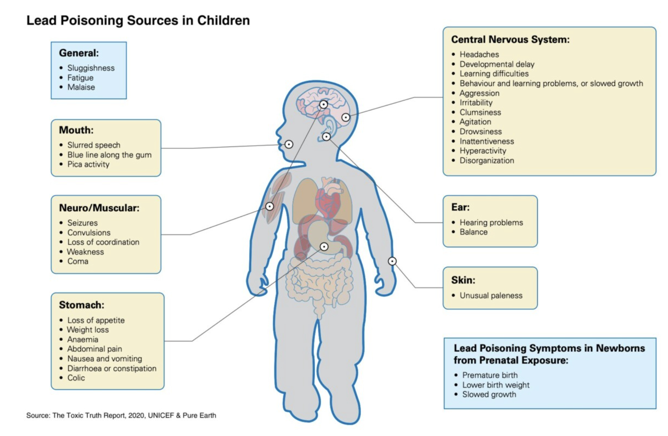 Lead is a cumulative toxicant that affects multiple body systems; this includes the neurological, hematological, gastrointestinal, cardiovascular and renal systems. According to the WHO, there is no known safe level of lead exposure. Relatively low levels of lead exposure previously considered ‘safe’ are now known to damage children’s health and impair their cognitive development. With even low-level exposure, lead is associated with brain damage, reduced IQ, decreased intelligence, learning difficulties, lower lifetime earnings, increased incidence of heart and kidney disease later in life, and increased tendency for violence.
