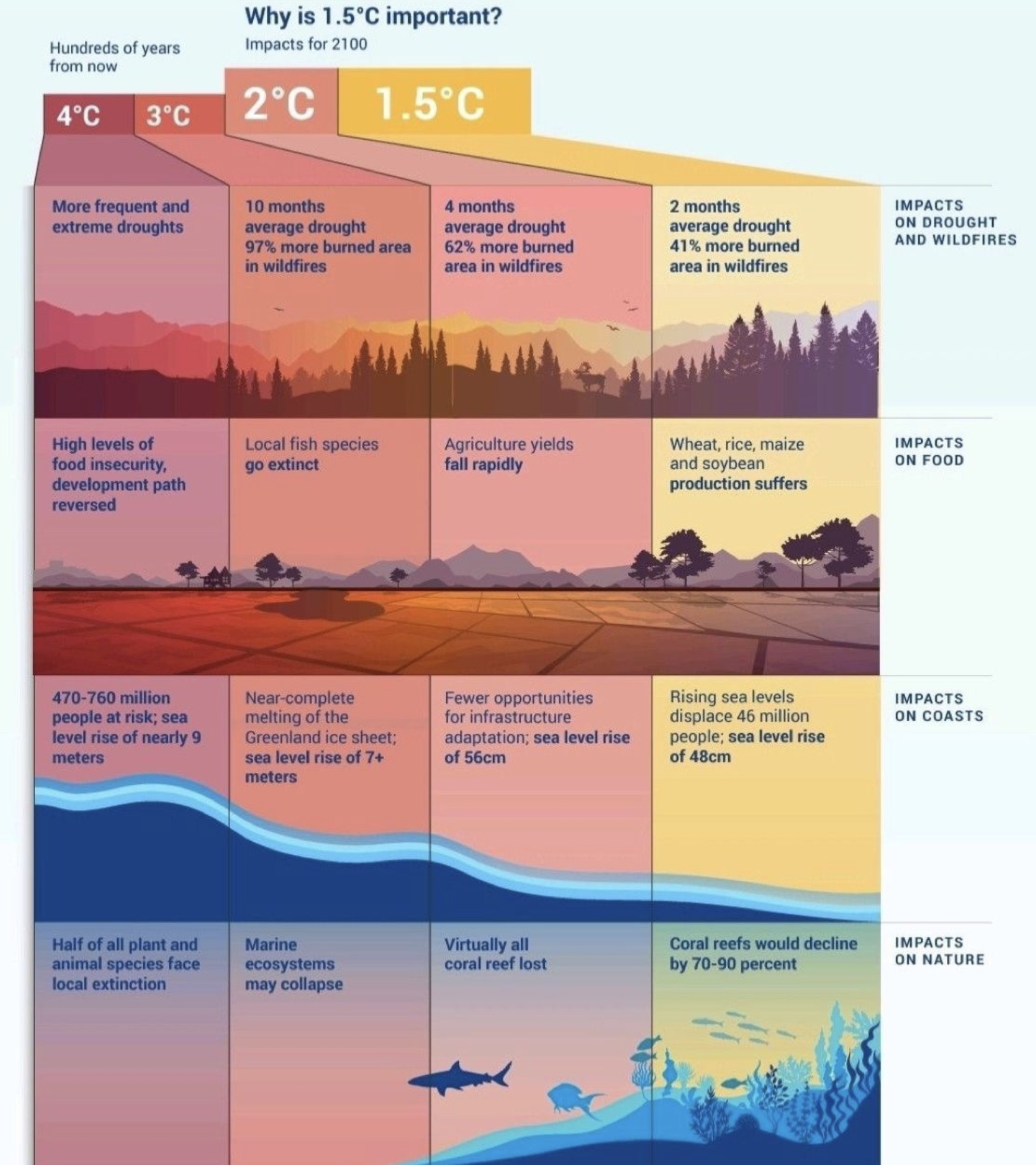 In a clear graphic, Behavior X Climate maps out the difference that a warming of 1.5°C, 2.0°C, 3.0°C and 4.0°C will make over the century.