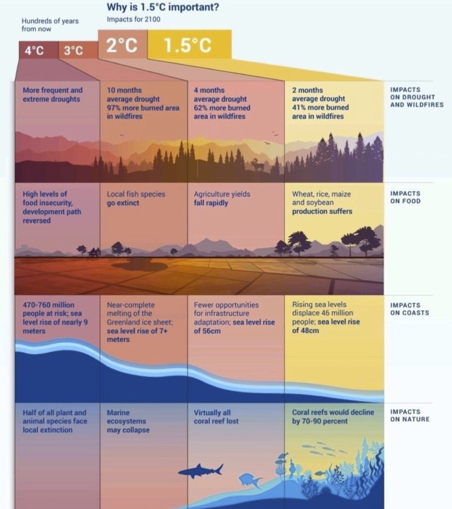 Crossing into 2.0°C of global warming seems small, but it isn’t. Remember that this is a global average over space and time. That means that in some places the rise will be much greater and more intense while in others not so great. We will experience this rise very differently region to region through local weather. This seemingly small rise will also have cumulative effects on other systems affected by incremental changes and these, in turn, will escalate into more observable disruptions of water circulation and availability, ecosystem function and biodiversity. According to most climate scientists, a 1.5°C increase marks the boundary between escalating disruption and irreversible calamitous damage.