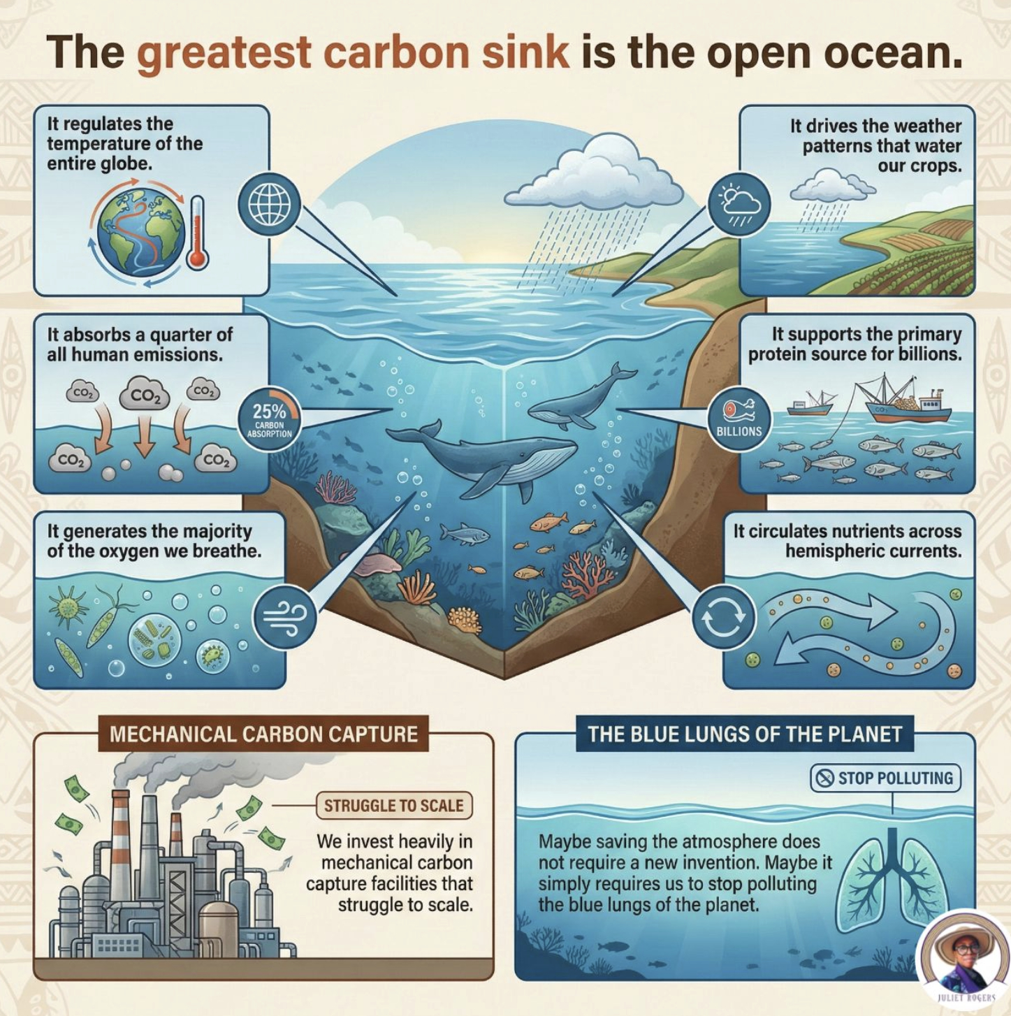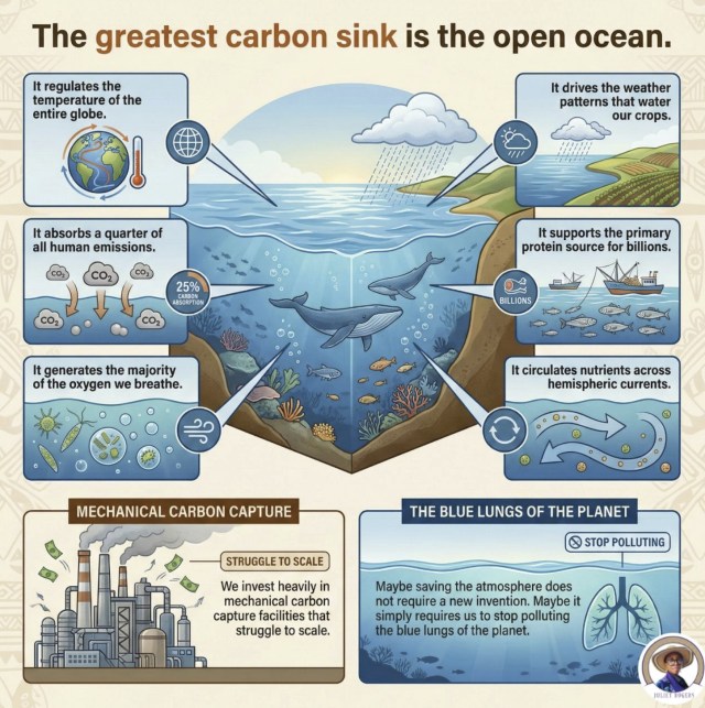 “Our obsession with engineered innovation is blinding us to the most powerful climate infrastructure already in existence. The global rush to fund mechanical carbon capture facilities exposes a profound flaw in the way we analyse systemic crises. We spend billions attempting to manufacture new technology while actively degrading the open ocean, a perfectly balanced biological engine that already absorbs a quarter of all human emissions for free.
